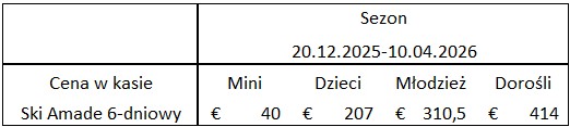 Wyciągi czynne są w godzinach od 8.15 do 16.30. Ceny sześciodniowych karnetów, pozwalających nam na korzystanie z wszystkich tras Ski-Amade zaczynają się od 133 euro do 266 euro w sezonie niskim oraz od 138 euro do 275,50 euro w sezonie wysokim. Dzieci do 6 roku życia otzymują w cenie 30 euro kartę mini, dzięki której mogą korzystać z wstępu na wszystkie stoki w Ski-Amade.