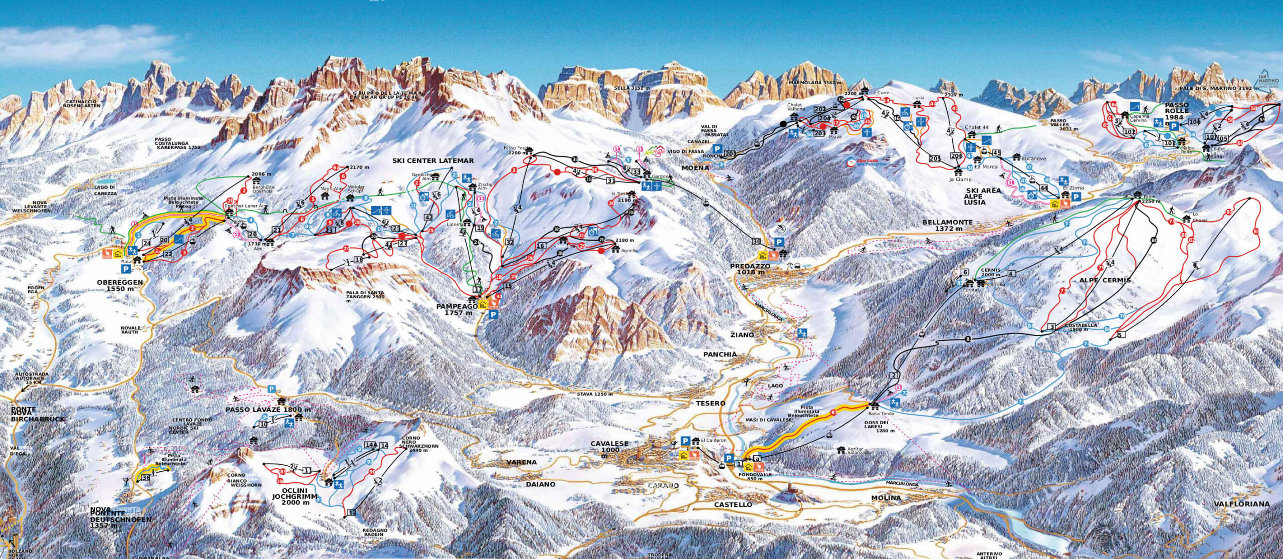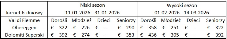 Zobacz hoteleRegion Val di Fiemme / Obereggen obejmuje pięć ośrodków narciarskich: ośrodek narciarski Latemar (Obereggen/Predazzo/Pampeago), Alpe Cermis, Alpe Luisa-Bellamonte, Lavazé-Oclini oraz Passo Rolle. Miłośnicy sportów zimowych mają szeroki wybór tras o różnym stopniu trudności, łącznie 111 kilometrów tras na wysokości od 860 do 2388 metrów n.p.m., do których można dotrzeć 45 wyciągami.