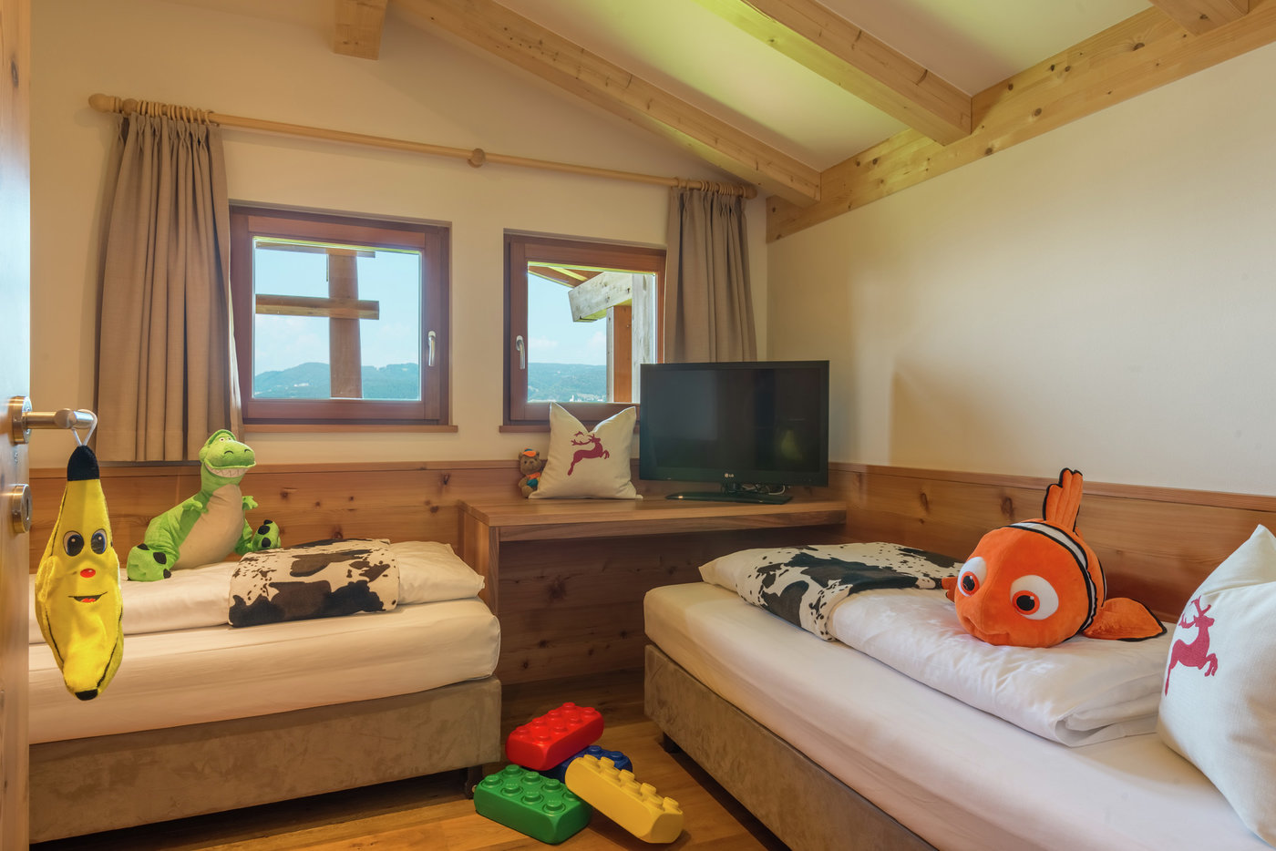 Pokój rodzinny „Oak”/”Pine” (4*) – przestronny pokój o powierzchni 40m² z widokiem na góry – „Oak” / na malowniczą miejscowość Fié allo Sciliar – „Pine”. Wykończony drewnem dębowym. Wyposażony w duże podwójne łóżko małżeńskie oraz rozkładaną sofę. Dysponuje dużą garderobą, prywatną łazienką z prysznicem i wanną oraz oddzielnym WC. Przeznaczony dla 2-4 osób.