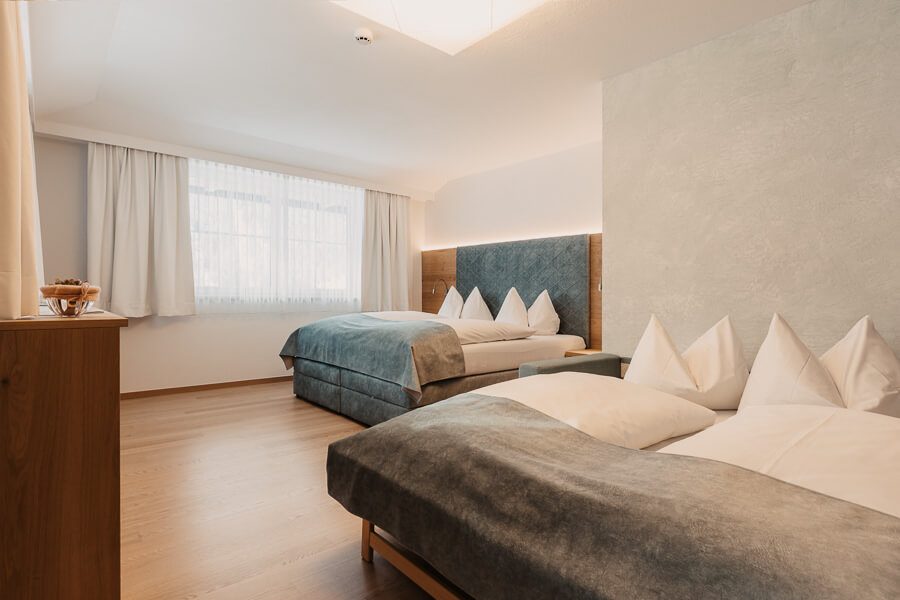 Pokój cztero-/pięcioosobowy: ok. 28-32 m2, dla 4-5 osób (łóżko podwójne i łóżka pojedyncze), z przedpokojem, łazienką z prysznicem, WC, suszarką do włosów, telefonem, WLAN, telewizją kablową, sejfem, radiem i balkonem