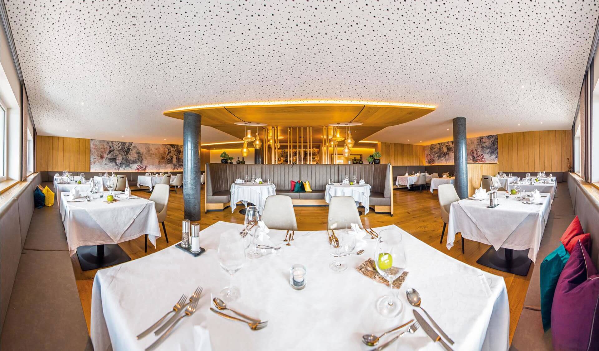 Wieczorem od godz. 19.00 serwowana jest kolacja z 5-daniowym menu, oferującym idealne połączenie kuchni włoskiej i południowotyrolskiej, stanowiącym relaksujący sposób na zakończenie dnia. Dodatkową różnorodność zapewniają wieczory tematyczne, takie jak Królewska Gala i Wieczór Południowotyrolski.